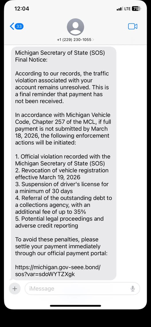 The message claims to be from the Michigan Secretary of State, warning recipients of an unresolved traffic violation tied to their account. It escalates quickly, calling itself a "final notice" and threatening serious consequences if payment isn't made by a specific deadline.