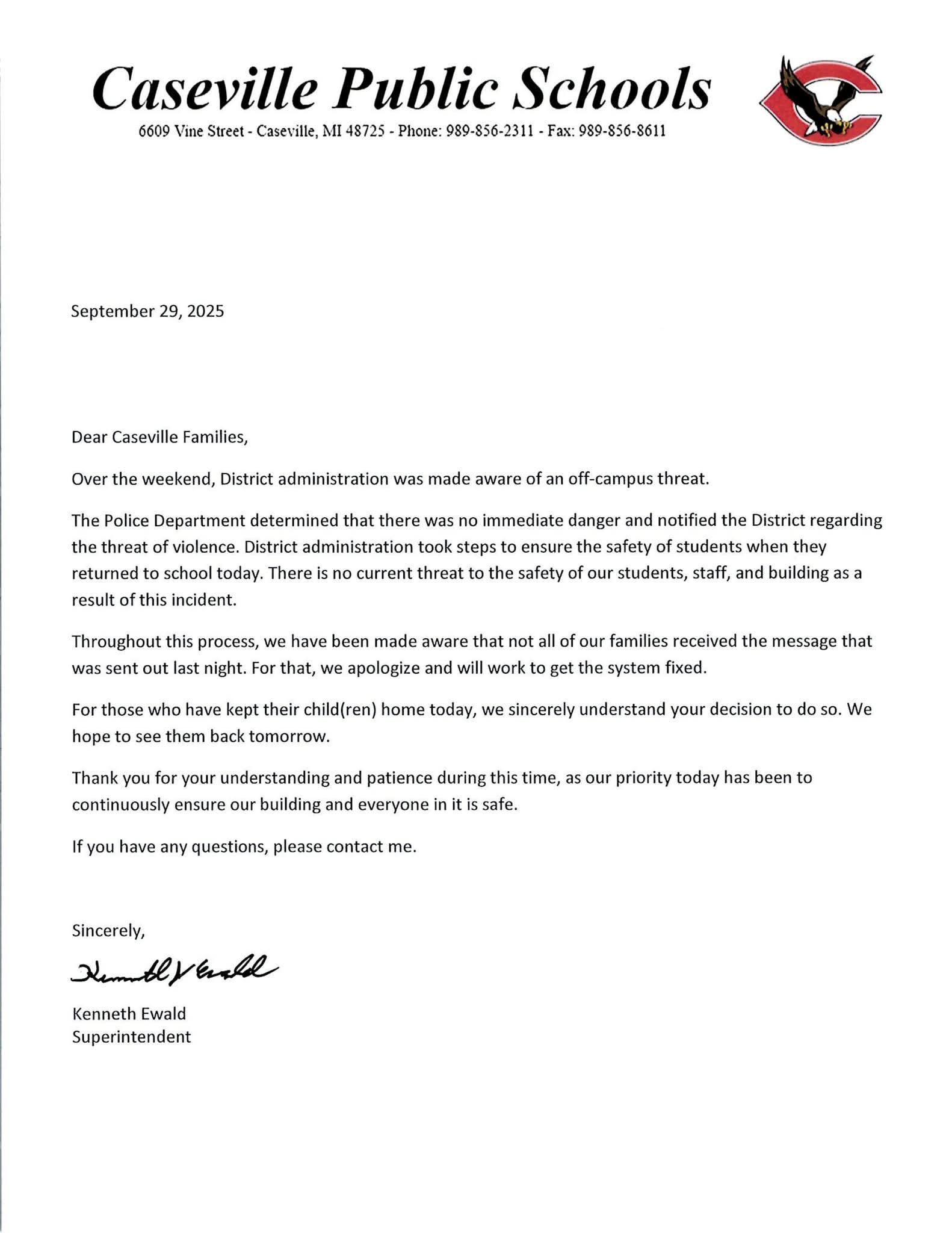 Parents first learned of the threat Sunday night via alert systems from the school, with multiple parents not receiving any alert at all. Monday, September 29, 2025, Caseville public schools released a statement on facebook. In the message, Superintendent Kenneth Ewald confirmed that the Police Department had investigated and determined there was "no immediate danger." He also addressed the notification delay, stating, "Throughout this process, we have been made aware that not all of our families received the message that was sent out last night. For that, we apologize and will work to get the system fixed."