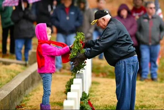 The event is to remember the fallen, honor those who served, and to teach the next generation the value of freedom. That is the mission of Wreaths Across America. To help with the event, sponsor a wreath, or volunteer to help on the National Wreaths Across America Day.