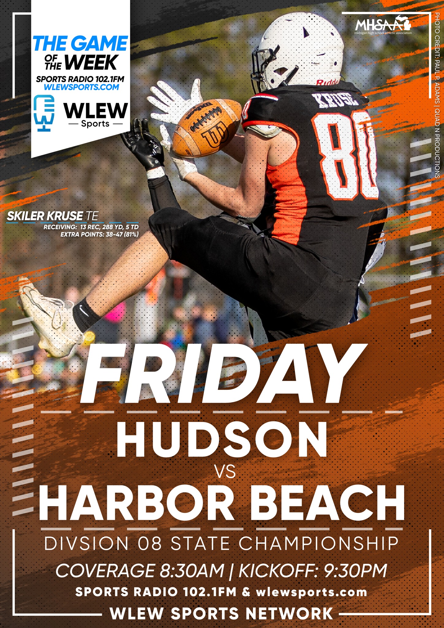 Harbor Beach jumped out to a 21-0 lead behind two first-quarter touchdown passes from senior quarterback Caden Bucholtz to tight ends Skiler Kruse and Matt Geiger, plus a 25-yard TD run by Bucholtz early in the second quarter. Hudson answered with long, clock eating scoring drives and twice pulled within one score, but a third quarter TD run and late 20-yard field goal from Kruse pushed the Pirates back in front by 11.