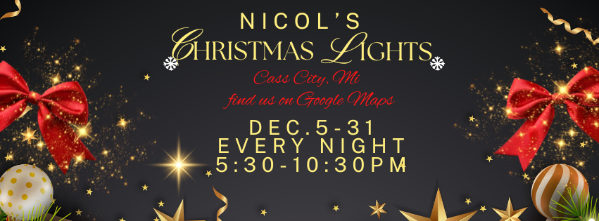 Nicol's Christmas Lights, also known as Nicol's Christmas Light Extravaganza, is held at 6250 Germania Road just south of Cass City, with the display running nightly from early December 5th through Dec. 31, 5:30-10:30 p.m..