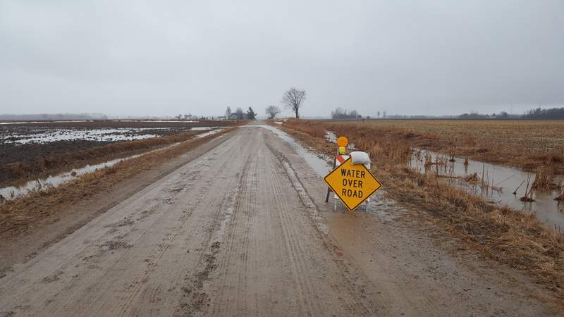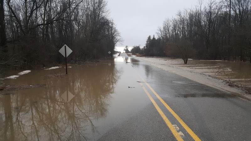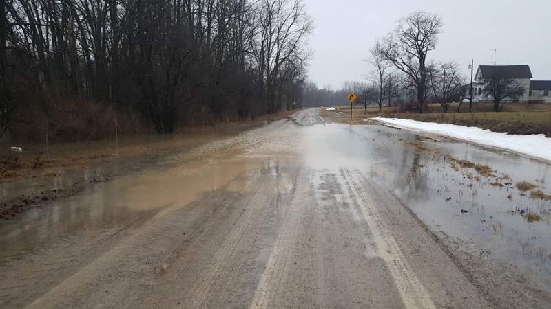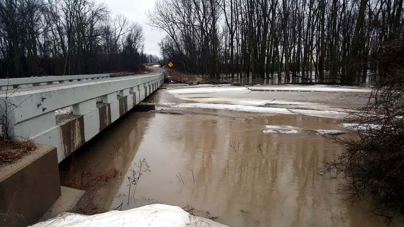 Rain, snow melt and run off from property with frozen ground that can't absorb any of it, has filled the ditches, creeks and rivers in the area. There are several areas in the upper Thumb dealing with water over the road, and water reaching the deck of bridges, both of which result in closures. Grassmere Road had a couple spots in several townships affected along with roads that connect with it. A bridge on Etzler Road carrying traffic over the Pinnebog River also had water almost to the underside of the bridge (right). Meanwhile the Huron County Road Commission continues to let us know of other problems. Eby Road over the Pinnebog River is closed between Elkton and Krohn Roads due to high water at a bridge in the area. Redman Rod over the Willow River is closed between Iseler and Huron City Roads in Bloomfield Township for the same reason. Limerick Road over the Pinnebog River is closed between Champagne and Grassmere Roads due to high water at the bridge in that area. In each case it could be a week before the road could be reopened after the bridges are inspected.