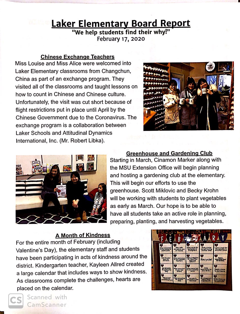 The Board report, which is pictured, provided a recap of two Chinese Exchange Teachers that spent some time at the school, which their time unfortunately was cut short by Coronavirus flight restrictions set by the Chinese Government.