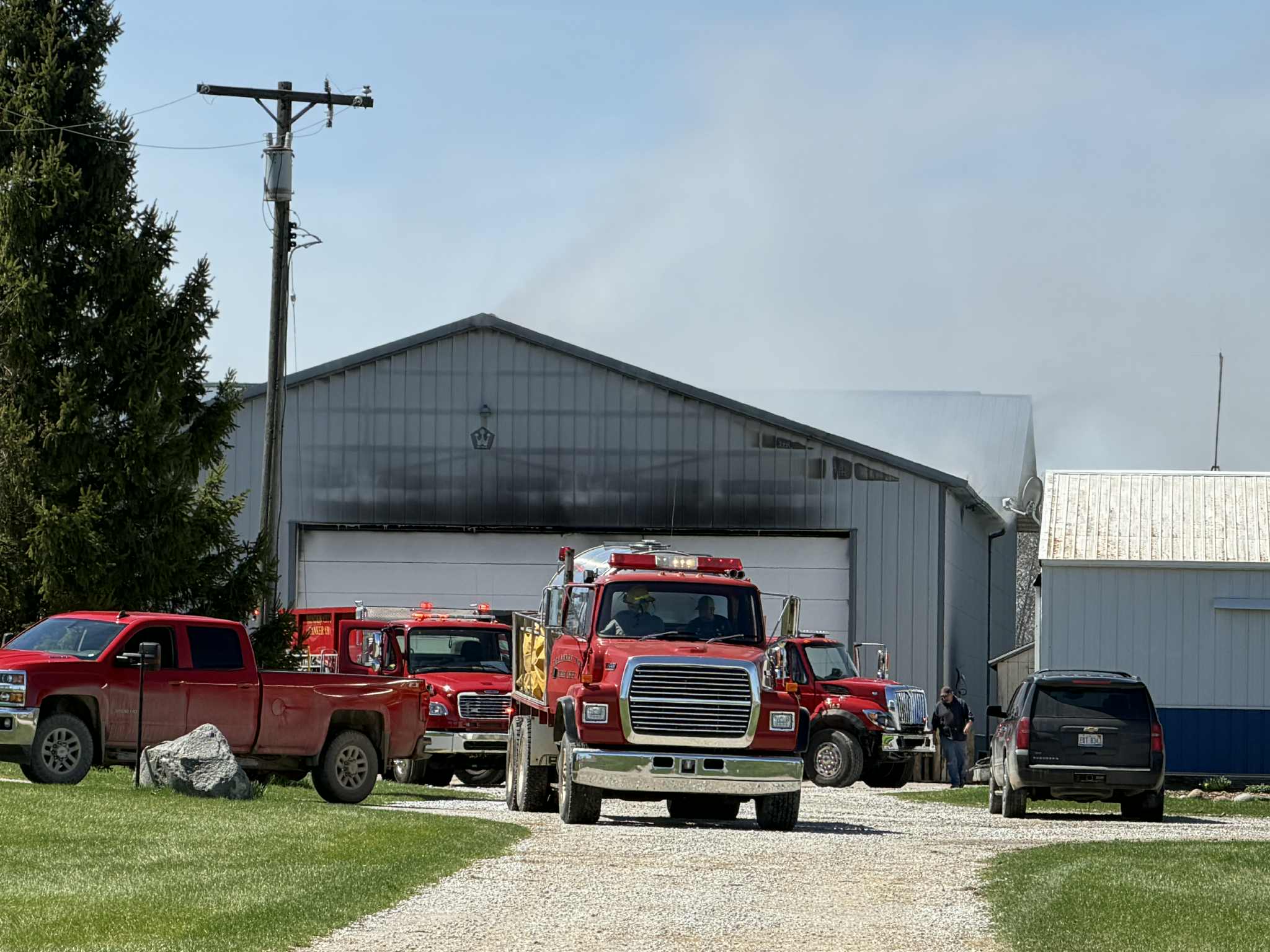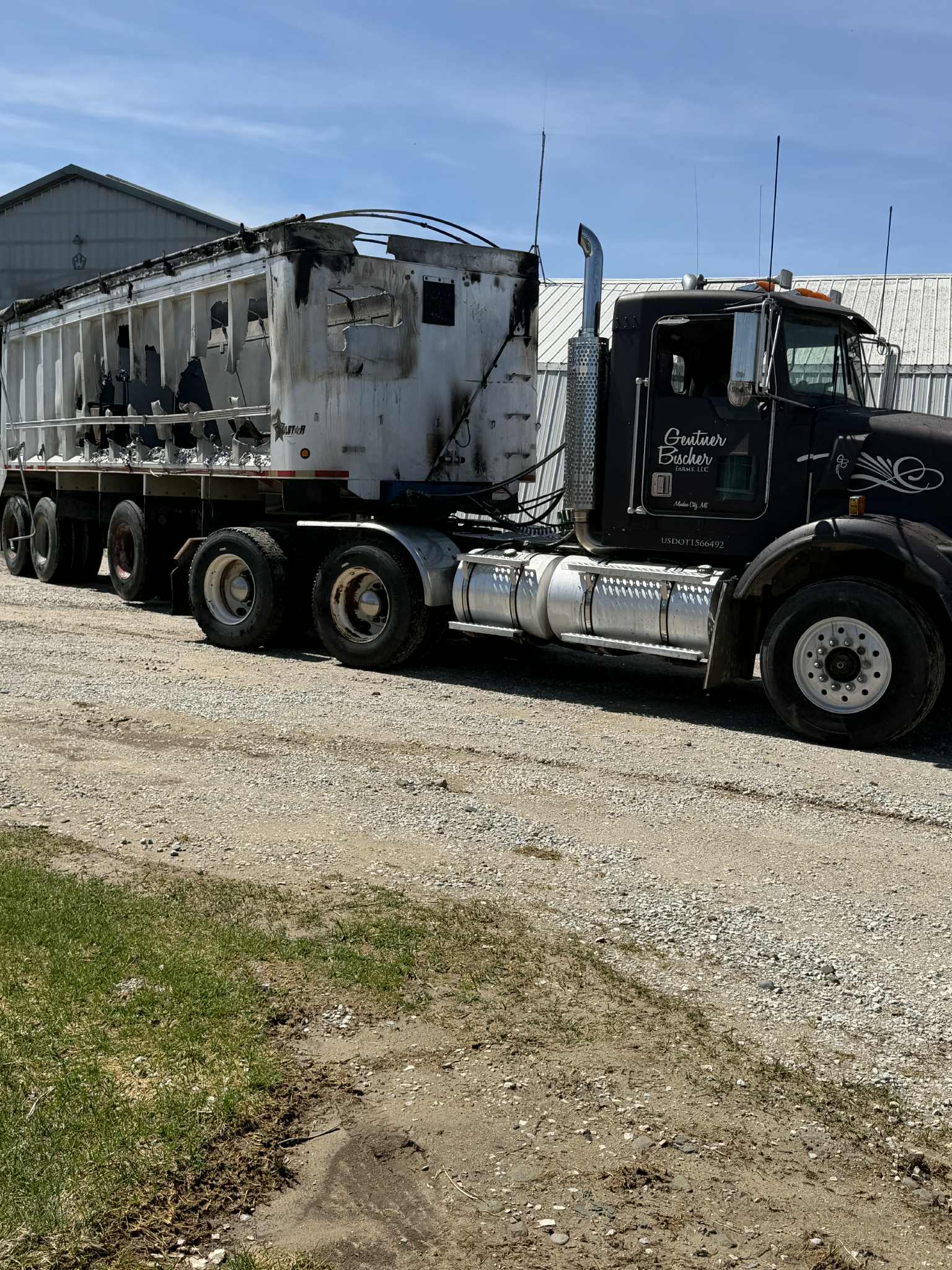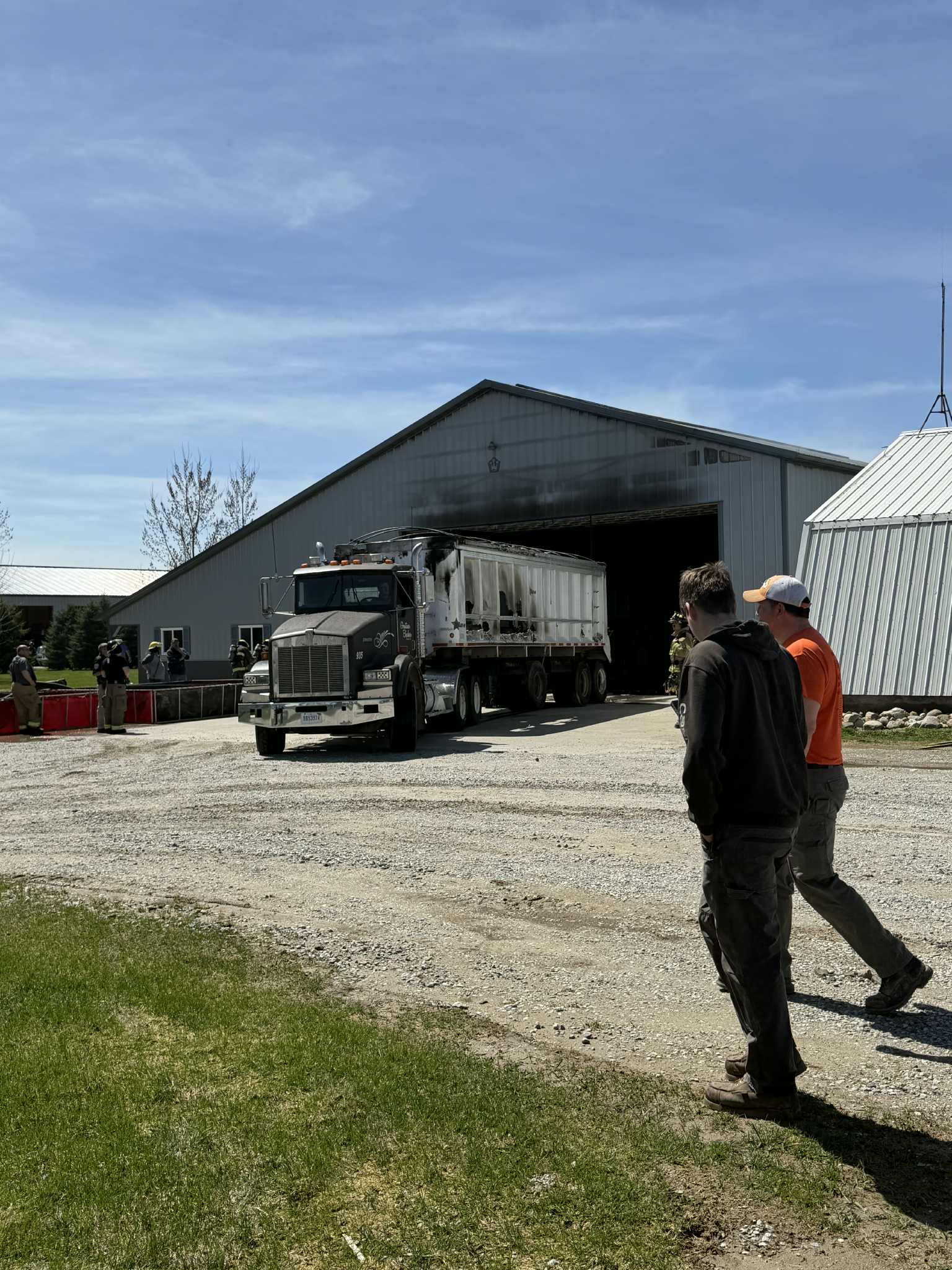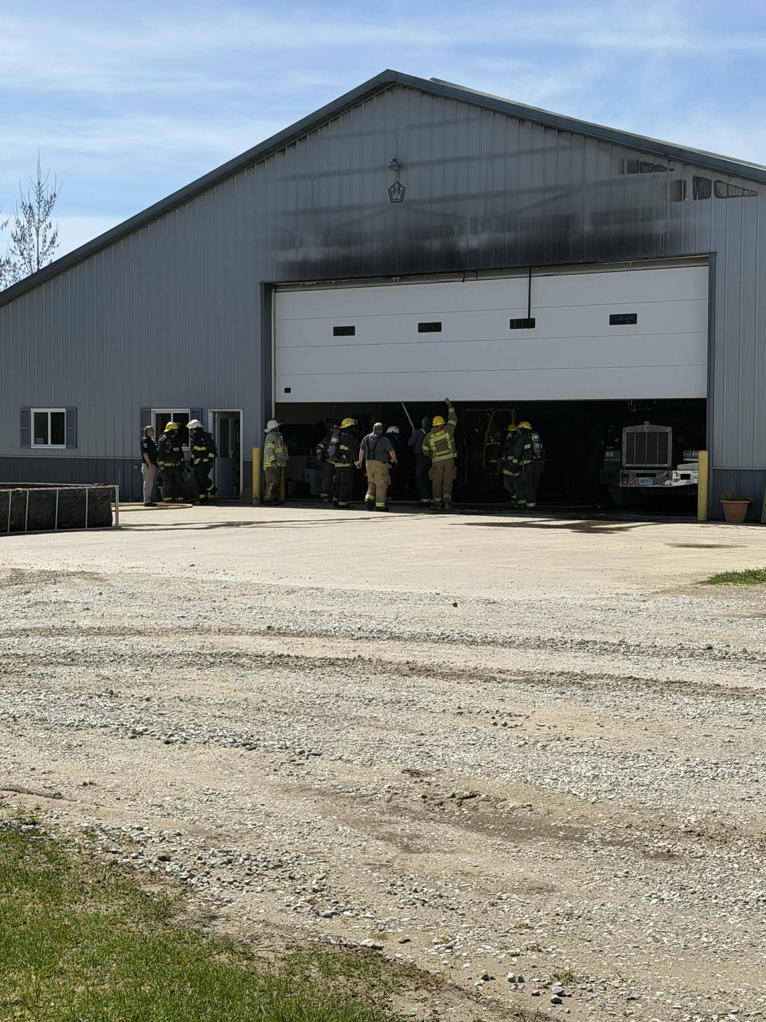 The fire was contained to the large shed. A dump trailer sustained heavy damage, while slight fire damage could be seen on the front and side of the structure.