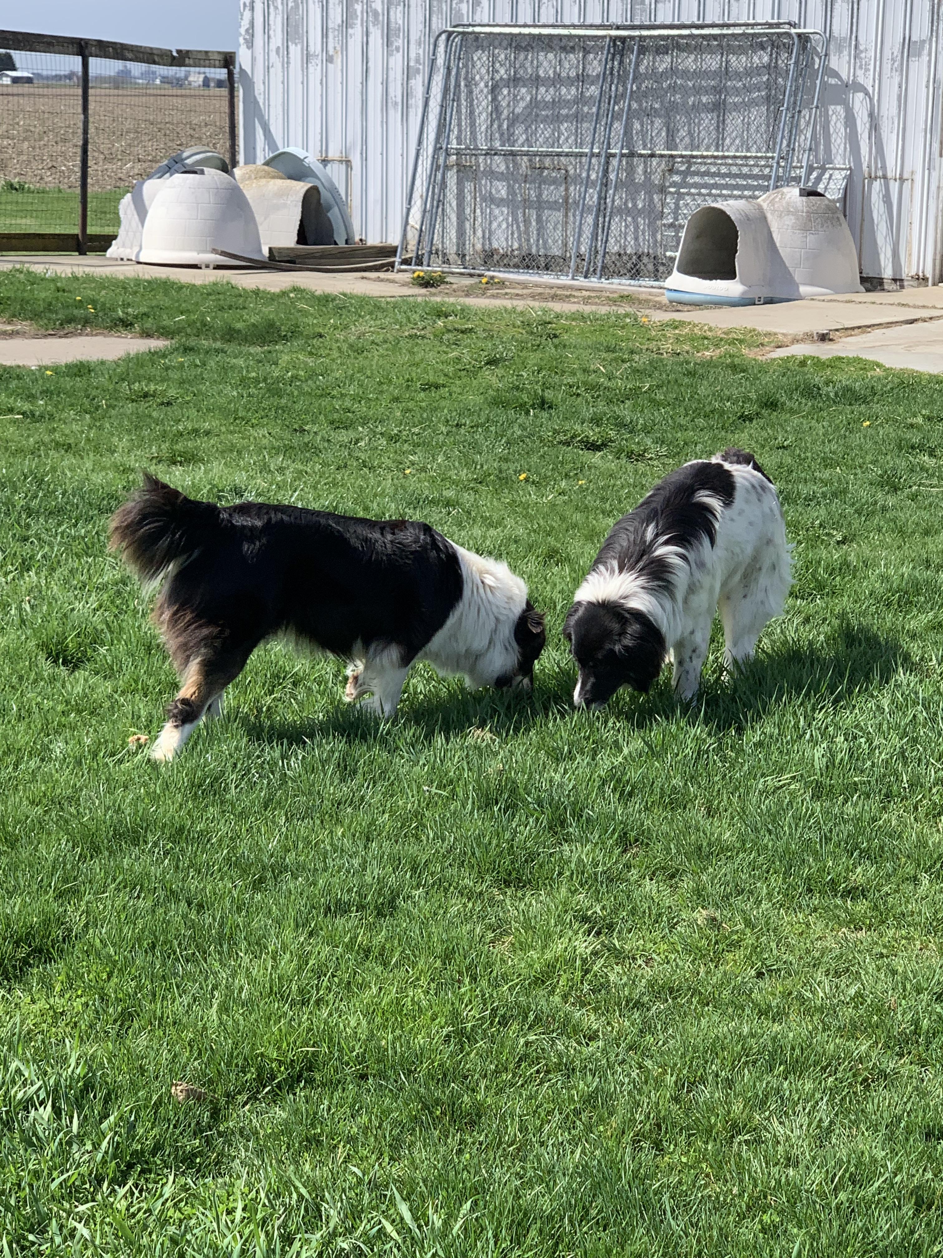 Fluff & Mellow are adult female Border Collies available for adoption in Elkton, MI. They are athletic, curious, loyal, playful, and smart, with medium-length black and white/cream coats.